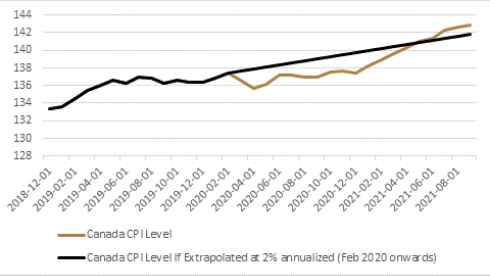 The question of whether inflation is transitory (or is facing a structural shift higher) continues to dominate the narrative in financial markets. Alarm bells are sounding that a hyperinflationary environment is unavoidable and right around the corner, given that the “base-effects” have rolled off the year-over-year readings while consumer prices have nonetheless remined high. The reality is that inflation in Canada is now just slightly higher than if the CPI had grown at the two percent annualized trendline that was in place prior to COVID; Weimar Germany this is not.