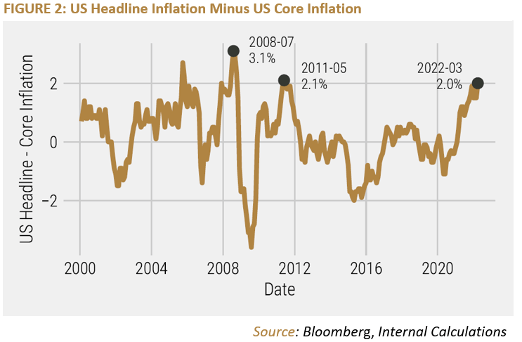 The good news for the Fed is that they will get a helping hand from the government as the fiscal contribution to GDP growth is likely to detract between -2.5% and -3.0% this year as pandemic stimulus expires. The bad news is that additional developments with the war in Ukraine are out of their control, and the ramifications of continued supply chain disruption for food and energy prices is a concern for consumer prices in the short-term. The spread between headline and core inflation is the largest it has been since 2011 (figure 2), only surpassed by the 2008 period when energy prices were skyrocketing.