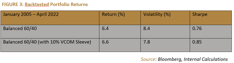 The 10% allocation to commodities used in this example is the model return stream of the Viewpoint Commodities (VCOM) strategy backtest and not indicative of future returns. However, the historical model is a good illustration of why adding a slice of commodity exposure to a traditional 60/40 portfolio can help to bulletproof portfolios in the context of inflation surprises. Adding a 10% allocation of VCOM to a balanced portfolio would have also reduced the year-to-date drawdown from -9.9% to -7.3%, a substantial reduction in portfolio risk as both equities and bonds struggle to contend with rising interest rates.