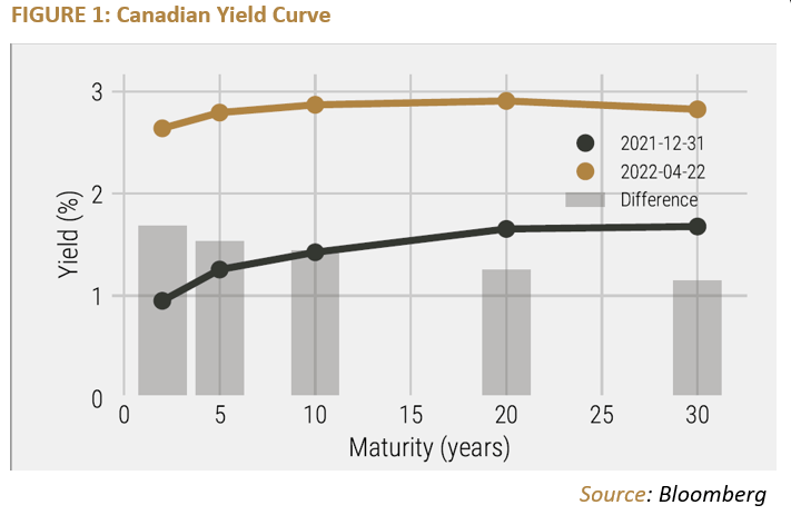 “How to Change” must have been on the Federal Reserve (Fed) Chair, Jerome Powell’s, reading list. Retiring the word “transitory” from the Fed’s lexicon at the end of 2021 set the stage for the Fed and other major central banks to telegraph that they would be aiming to rectify the perception that they are behind the curve when it comes to battling inflation. Powell then used the fresh start of 2022 to communicate more meaningfully to financial markets that tackling rising consumer prices is priority number one for the Fed. The proverbial punchbowl of liquidity is in the process of being removed, with interest rates rising in anticipation of one of the more hawkish central bank responses financial markets have witnessed since the Volcker-era. Markets are pricing in an additional 250 basis points of rate hikes by the Fed this year, which would bring the overnight lending rate to roughly 2.7% by the end of 2022, surpassing the pre-pandemic high from 2019. A similar situation in Canada has materialized, as market participants expect the Bank of Canada to raise the overnight lending rate another 200 basis points by the end of the year, which would bring the overnight lending rate well above pre-pandemic levels. As a result of the 2022 hawkish pivot, Canadian bond yields have risen drastically, with the 10-year yield rising by almost 1.5% year-to-date (figure 1).